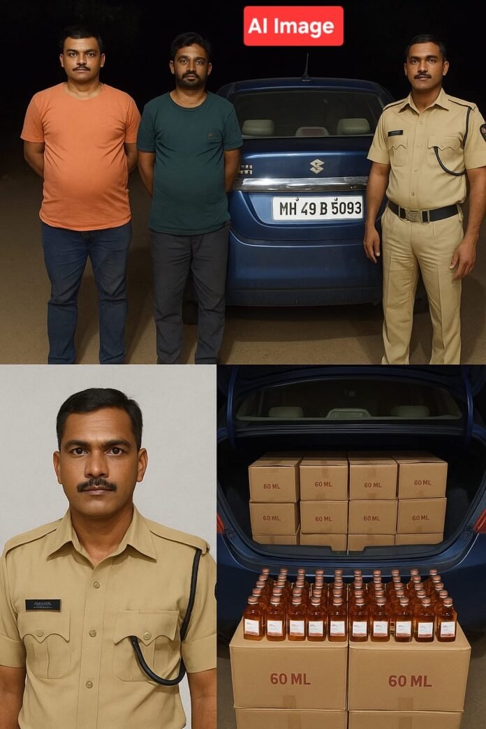 पोलिसांना मिळालेल्या गुप्त माहितीच्या आधारे, MH 49 B 5093 या क्रमांकाच्या निळ्या स्विफ्ट डिझायरकारची झडती घेतली असता, २८ खोक्यांत भरलेल्या २८०० देशी दारूच्या बाटल्या (९० एमएल) आढळून आल्या. या बाटल्यांची किंमत १.१२ लाख रुपये असून, वाहतूक करत असलेली गाडी देखील ४ लाख किंमतीची असल्यानेसंपूर्ण मुद्देमालाची एकूण रक्कम ५.१२ लाख रुपये आहे.