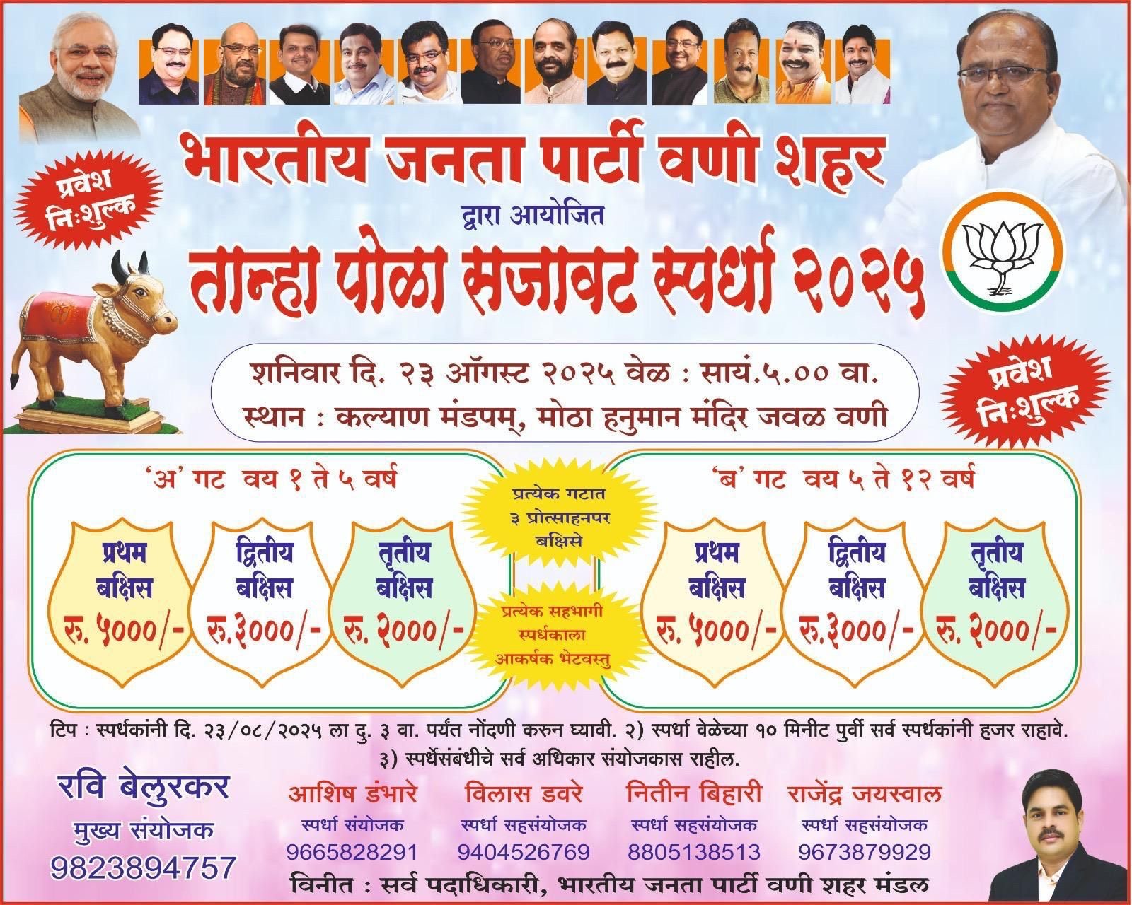 वणी : पोळा सणाचे औचित्य साधून भारतीय जनता पार्टी वणी शहराच्या वतीने तान्हा पोळा सजावटस्पर्धेचे आयोजन करण्यात आले आहे. ही स्पर्धा शनिवार, दि. २३ ऑगस्ट २०२५ रोजी सायं. ५.०० वा. कळ्याण मंडप, मोठा हनुमान मंदिर जवळ, वणी येथे होणार आहे.
