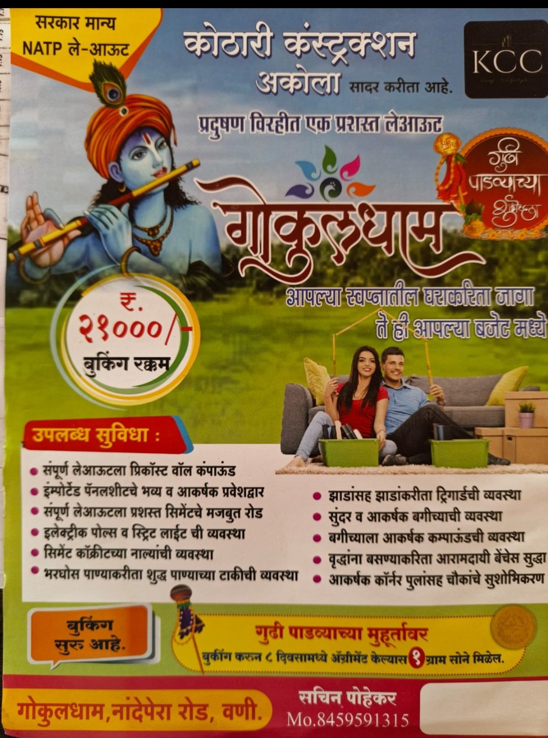 कोठारी कन्स्ट्रक्शन अकोला यांच्या वतीने “गोकुळधाम” हा आधुनिक सोयीसुविधांनी सजलेला ले-आऊट प्रकल्प वणीकरांसाठी उपलब्ध झाला आहे. केवळ ₹२१०००/- बुकिंग रकमेवर आपल्या स्वप्नातील घराचे स्वामित्व मिळविण्याची सुवर्णसंधी नागरिकांना देण्यात आली आहे.