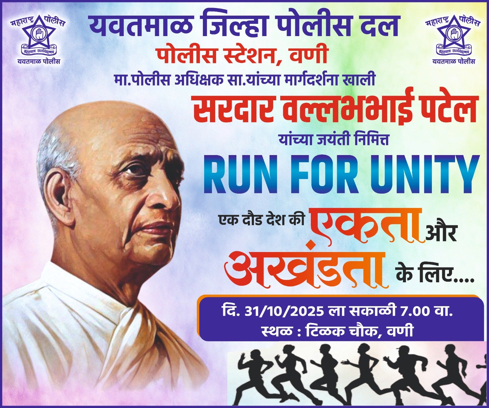 *सर्वांना सूचित करण्यात येते की, उद्या दिनांक 31/10/2025 रोजी यवतमाळ पोलीस दला तर्फे माननीय पोलीस अधीक्षक श्री कुमार चिंता साहेब यांच्या मार्गदर्शनाखाली लोहपुरुष सरदार वल्लभभाई पटेल यांच्या जयंती निमित्त पोलीस स्टेशन वणी च्या वतीने RUN FOR UNITY एक दोड देश की एकता और अखंडता के लिये मॅरेथॉन /रनिंग टिळक चौक वणी येथून सकाळी 07/00 वाजता रनिंगला सुरुवात होऊन पुढे वरोरा रोड वरील कृषी उत्पन्न बाजार समिती पर्यंत व तेथून परत टिळक चौक वणी अशी रनिंग असून त्या रनिंग मध्ये भाग घेण्याकरिता वणी शहरातील सर्व शाळा व महाविद्यालयावरील सन्माननीय शिक्षक वृंद/विद्यार्थी, सन्माननीय पत्रकार बंधू, सन्माननीय व्यापारी संघटनेचे अध्यक्ष/सदस्य, वकील संघ, डॉक्टर एसोसिएशन, रोटरी क्लब तसेच प्रतिष्ठित नागरिक, आणि सर्व वणीकरांनी टी शर्ट,लोअर, ट्रॅक सूट, शूज घालून संपूर्ण तयारीने टिळक चौक वणी येथे सकाळी ठीक 07/00 वाजता उपस्थित राहतील ही नम्र विनंती.*