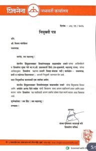 ही नियुक्ती उपमुख्यमंत्री तथा शिवसेना नेते मा. श्री. एकनाथजी शिंदे यांच्या आशीर्वादाने व पक्षाचे वरिष्ठ पदाधिकारी संजय पुष्पलता भागोजी मोरे (शिवसेना सचिव) यांच्या स्वाक्षरीने जाहीर करण्यात आली आहे.