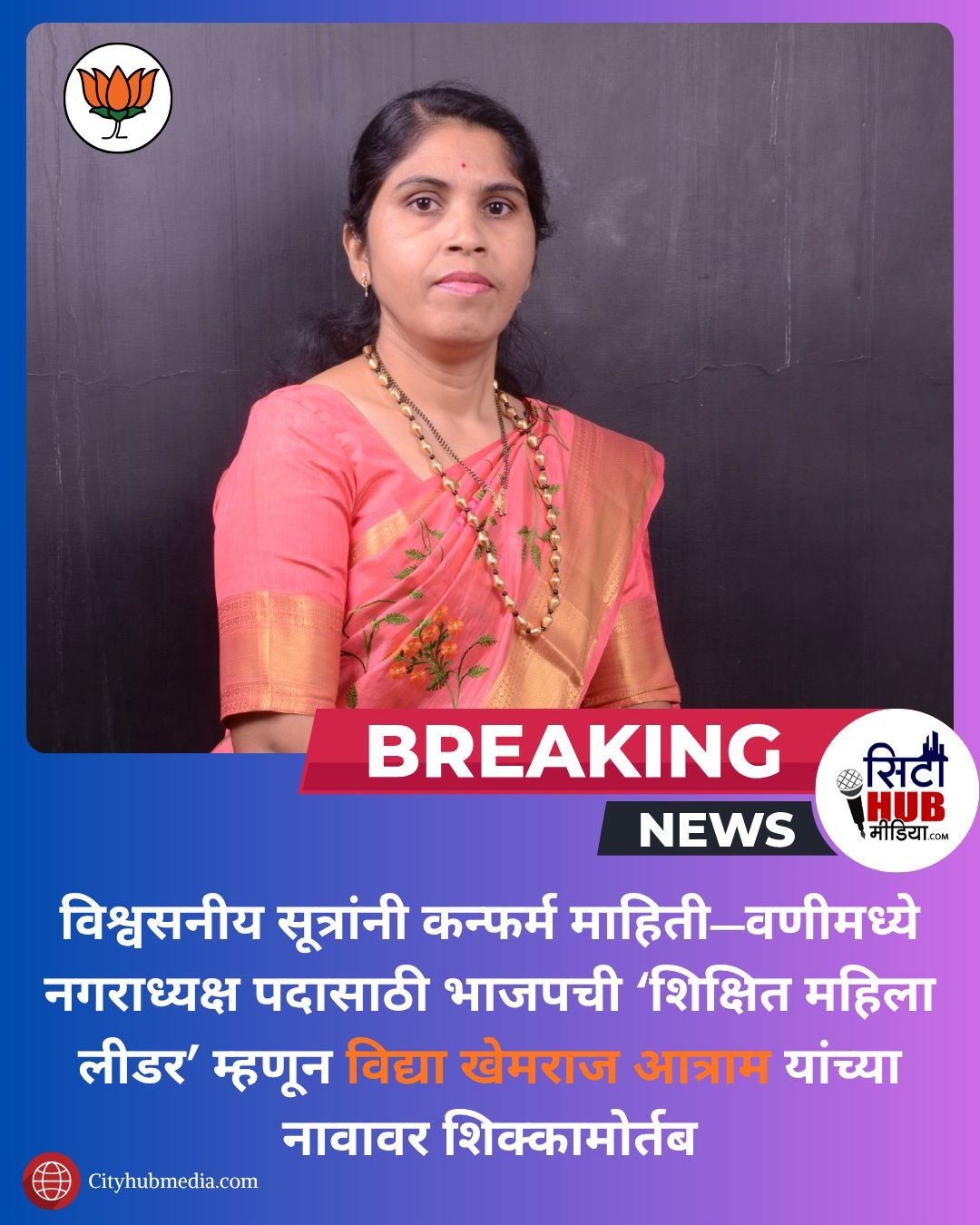 वणी नगरपालिकेच्या आगामी निवडणुकीत मोठी हालचाल घडली आहे. विश्वसनीय वरिष्ठ सूत्रांनी दिलेल्या माहितीनुसार, अनुसूचित जमाती महिला राखीव असलेल्या नगराध्यक्ष पदासाठी भाजपने विद्या खेमराज आत्राम यांच्या नावावर शिक्कामोर्तब केले आहे. पक्षाच्या अंतर्गत स्तरावर गेल्या काही दिवसांत वेगाने झालेल्या बैठका आणि चर्चांनंतर हा निर्णय झाल्याचे कळते.