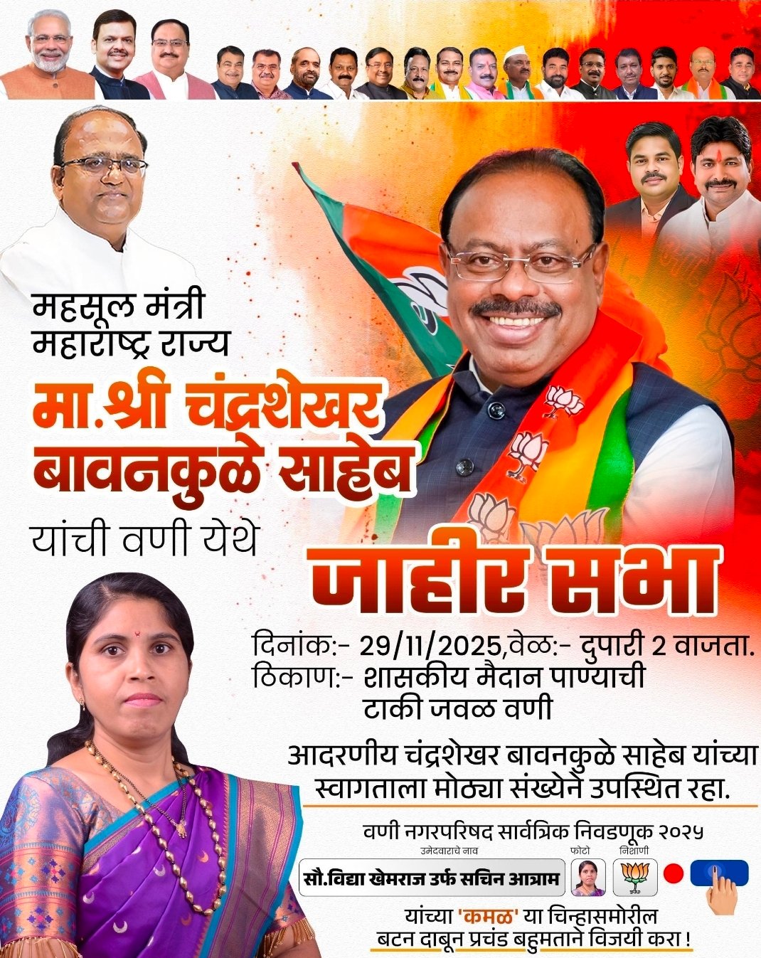 आगामी नगरपालिका निवडणुकांच्या पार्श्वभूमीवर भाजपने वणीमध्ये प्रचाराचा जोर वाढविला असून या प्रचाराला गती देण्यासाठी महाराष्ट्राचे महसूल मंत्री मा. श्री चंद्रशेखर बावनकुळे साहेब यांची जाहीर सभा 29 नोव्हेंबर 2025 रोजी आयोजित करण्यात आली आहे. दुपारी 2 वाजता शासकीय मैदान, पाण्याची टाकी जवळ येथे ही सभा पार पडणार आहे.