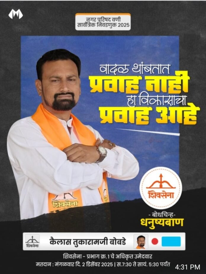 प्रभाग क्रमांक एकमध्ये शिवसेनेचे उमेदवार कैलाश बोबडे हे सध्या प्रचंड चर्चेत असून त्यांच्या प्रचाराला दिवसेंदिवस गती मिळत आहे. “आश्वासन देत नाही… ते पूर्ण करतो,” हा थेट आणि स्पष्ट संदेश देत ते मतदारांच्या मनात विश्वास निर्माण करत आहेत.
