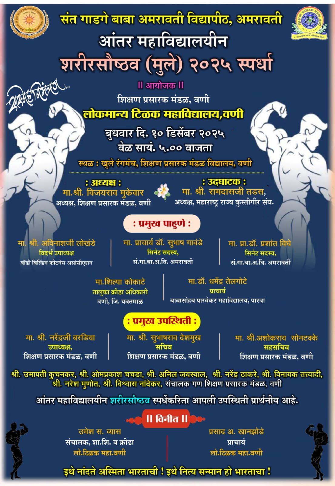 वणी येथील शिक्षण प्रसारक मंडळ संचालित लोकमान्य टिळक महाविद्यालयाच्या यजमानत्वाखाली संत गाडगे बाबा अमरावती विद्यापीठ, अमरावतीतर्फे आंतर महाविद्यालयीन शरीर सौष्ठव (मुले) स्पर्धा २०२५ चे भव्य आयोजन करण्यात आले आहे.