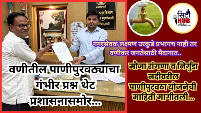 आज त्यांनी वणी शहरातील पाणीपुरवठ्याचा गंभीर प्रश्न नगरपरिषदेच्या मुख्याधिकारी यांच्यासमोर मांडत लेखी निवेदन सादर केले. हे निवेदन मुख्याधिकारी, नगर परिषद वणी यांना देण्यात आले असून, शहरातील पाणीपुरवठ्याची सद्यस्थिती काय आहे याची सविस्तर व अधिकृत माहिती देण्याची मागणी करण्यात आली आहे.
