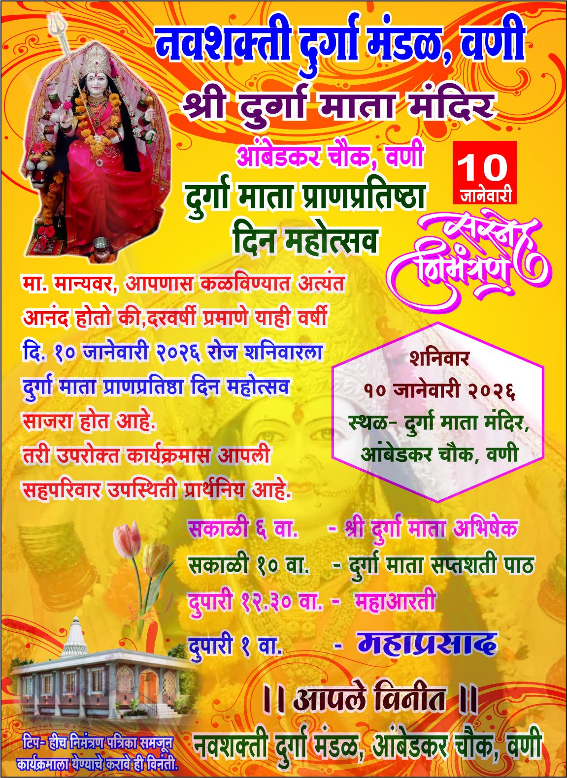 आंबेडकर चौक, वणी येथील नवशक्ती दुर्गा मंडळ संचालित श्री दुर्गा माता मंदिरात शनिवार, १० जानेवारी २०२६ रोजी दुर्गा माता प्राणप्रतिष्ठा दिन महोत्सव भक्तिभावाने साजरा करण्यात येणार आहे. नवसाला पावणारी देवी म्हणून परिसरात प्रसिद्ध असलेल्या या मंदिराची स्थापना १० जानेवारी १९९८ रोजी करण्यात आली असून, मंदिराचे ७ ऑक्टोबर २०२१ रोजी नुतनीकरण व जीर्णोद्धार करण्यात आले होते.
