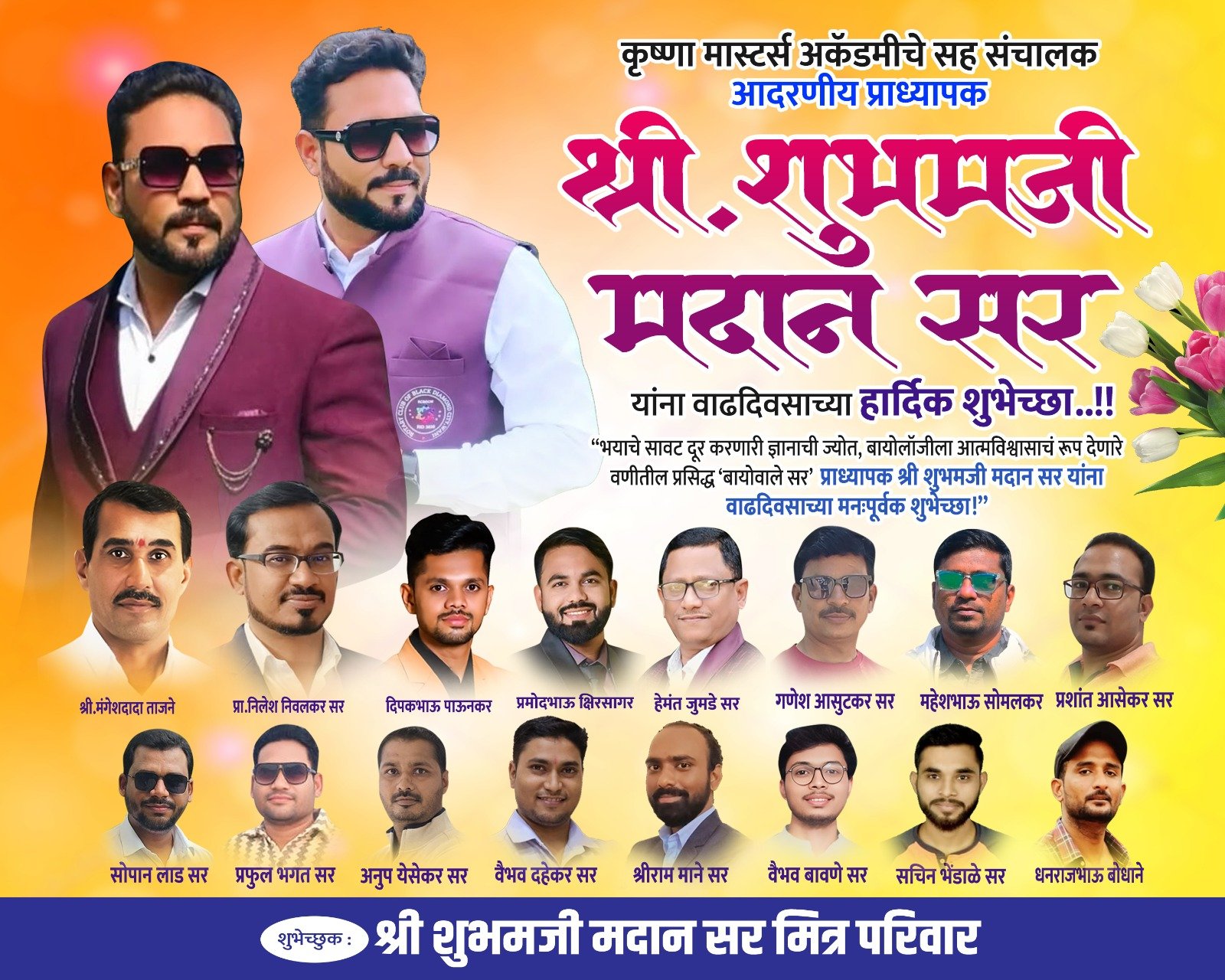 विद्यार्थियों के प्रेरणास्रोत प्रा. शुभम मदान को जन्मदिन पर शुभकामनाओं की बौछारवणी : “Biowale सर” शुभम मदान का जन्मदिन पर उनके मित्र परिवार की ओरसे बहुत बहुत शुभकामनाएं दी गई हैं।