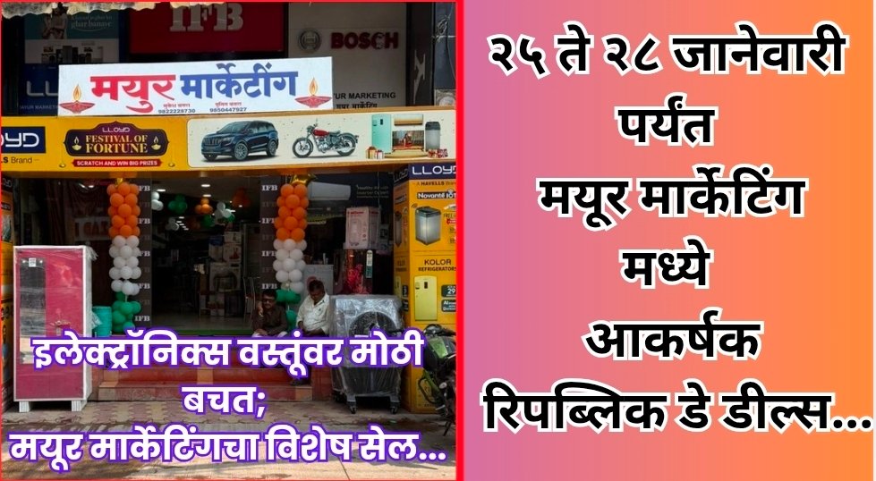 देशाचा ७६ वा प्रजासत्ताक दिन उत्साहात साजरा होत असताना, वणी शहरातील विश्वासार्ह इलेक्ट्रॉनिक्स शोरूम मयूर मार्केटिंग येथे “Great Republic Day Sale” अंतर्गत ग्राहकांसाठी भव्य सवलत महोत्सव सुरू करण्यात आला आहे. या सेलमध्ये विविध नामांकित कंपन्यांच्या इलेक्ट्रॉनिक व घरगुती उपकरणांवर ३० ते ७० टक्क्यांपर्यंत आकर्षक सूट देण्यात येत आहे.