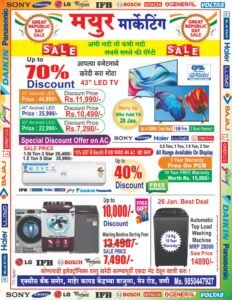 देशाचा ७६ वा प्रजासत्ताक दिन उत्साहात साजरा होत असताना, वणी शहरातील विश्वासार्ह इलेक्ट्रॉनिक्स शोरूम मयूर मार्केटिंग येथे “Great Republic Day Sale” अंतर्गत ग्राहकांसाठी भव्य सवलत महोत्सव सुरू करण्यात आला आहे. या सेलमध्ये विविध नामांकित कंपन्यांच्या इलेक्ट्रॉनिक व घरगुती उपकरणांवर ३० ते ७० टक्क्यांपर्यंत आकर्षक सूट देण्यात येत आहे.