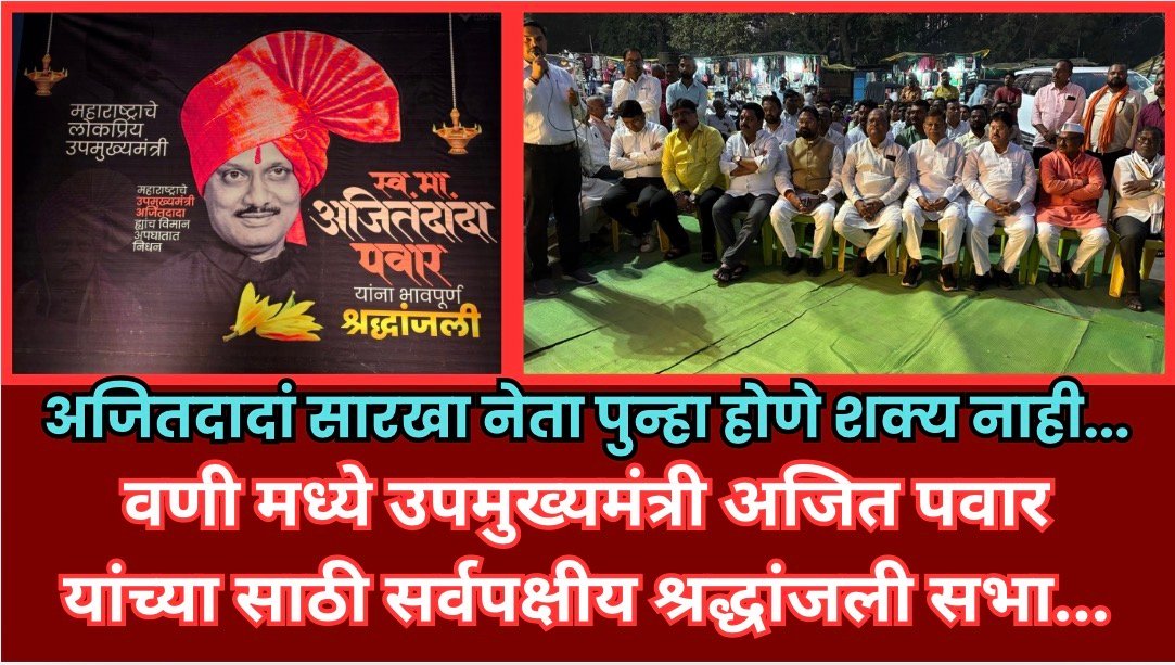उपमुख्यमंत्री अजित पवार यांच्या अकाली निधनाने संपूर्ण महाराष्ट्र शोकसागरात बुडाला असून, वणी शहरातील टिळक चौकात छत्रपती शिवाजी महाराजांच्या पुतळ्याजवळ आयोजित शोकसभेमध्ये सर्वपक्षीय नेते, पदाधिकारी, कार्यकर्ते आणि नागरिक मोठ्या संख्येने उपस्थित होते. शोकसभेमध्ये एकच सूर उमटला की, विकासाची दृष्टी, स्पष्ट भूमिका आणि जनतेशी नाते असलेला अजित पवारांसारखा नेता पुन्हा होणे शक्य नाही.