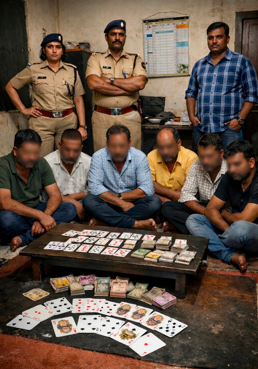 कारवाईदरम्यान घटनास्थळावरून ५२ पत्त्यांचा संच तसेच १,६५० रुपये रोख रक्कम जप्त करण्यात आली. याशिवाय उपस्थित आरोपींची पंचांसमक्ष अंगझडती घेण्यात आली असता त्यांच्याकडून विविध रकमेची रोकड जप्त करण्यात आली. या सर्वांची मिळून एकूण ७,२२० रुपयांचा मुद्देमाल पोलिसांनी ताब्यात घेतला.