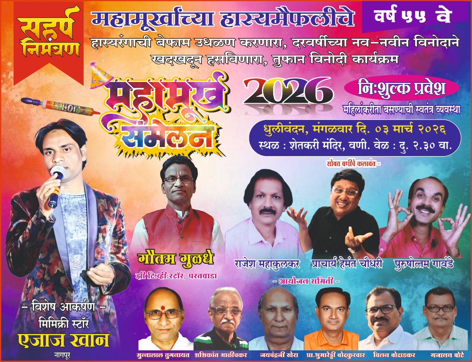 हास्याचा हा महाकुंभ अनुभवण्यासाठी वणीतील जास्तीत जास्त नागरिकांनी उपस्थित राहावे, असे आवाहन आयोजन समितीच्या वतीने करण्यात आले आहे.
