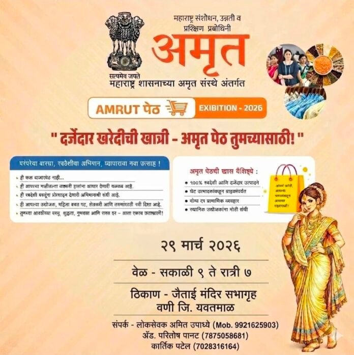 येत्या २९ मार्च रोजी आयोजित ‘अमृत पेठ – २०२६’ मुळे वणीकरांना थेट उत्पादकांकडून दर्जेदार वस्तू खरेदी करण्याची सुवर्णसंधी मिळणार आहे.