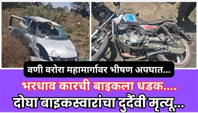 वणी-वरोरा राज्यमार्गावर बुधवारी दुपारी एक काळजाचा थरकाप उडवणारी घटना घडली. भरधाव वेगाने येणाऱ्या एका कारने दुचाकीला मागून जोरात धडक दिल्याने झालेल्या भीषण अपघातात दोन जणांना आपले प्राण गमवावे लागले आहेत, तर दोन जण गंभीर जखमी झाले आहेत.