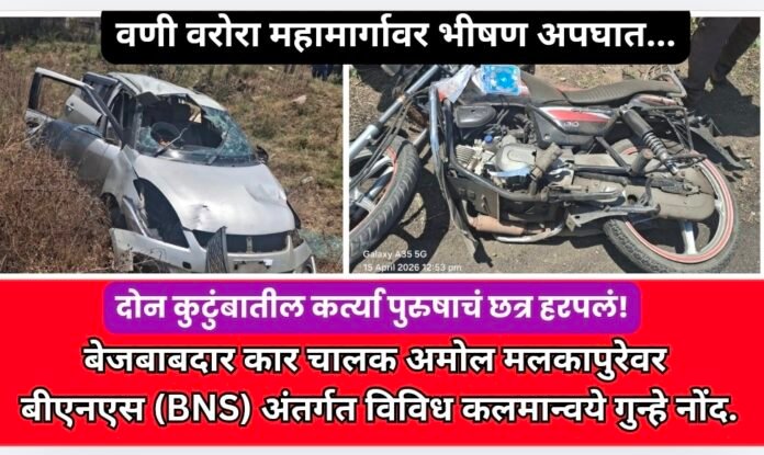 याप्रकरणी मृत अनिल कुत्तरमारे यांचे भाऊ सुनील बाबाराव कुत्तरमारे यांच्या फिर्यादीवरून वणी पोलीस ठाण्यात कार चालक अमोल मलकापुरे (रा. मारेगाव) याच्याविरुद्ध गुन्हा नोंदवण्यात आला आहे. पोलिसांनी भारतीय न्याय संहितेच्या (BNS) खालील कलमान्वये कारवाई केली आहे: