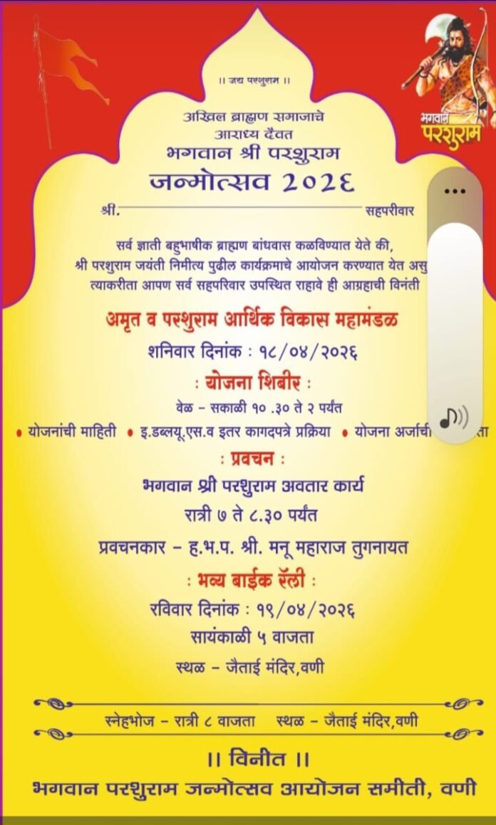 या सर्व कार्यक्रमांना सर्व ज्ञाती बहुभाषीक ब्राह्मण बांधवांनी सहपरिवार उपस्थित राहून सोहळ्याची शोभा वाढवावी, अशी विनंती भगवान परशुराम जन्मोत्सव आयोजन समिती, वणी यांनी केली आहे.